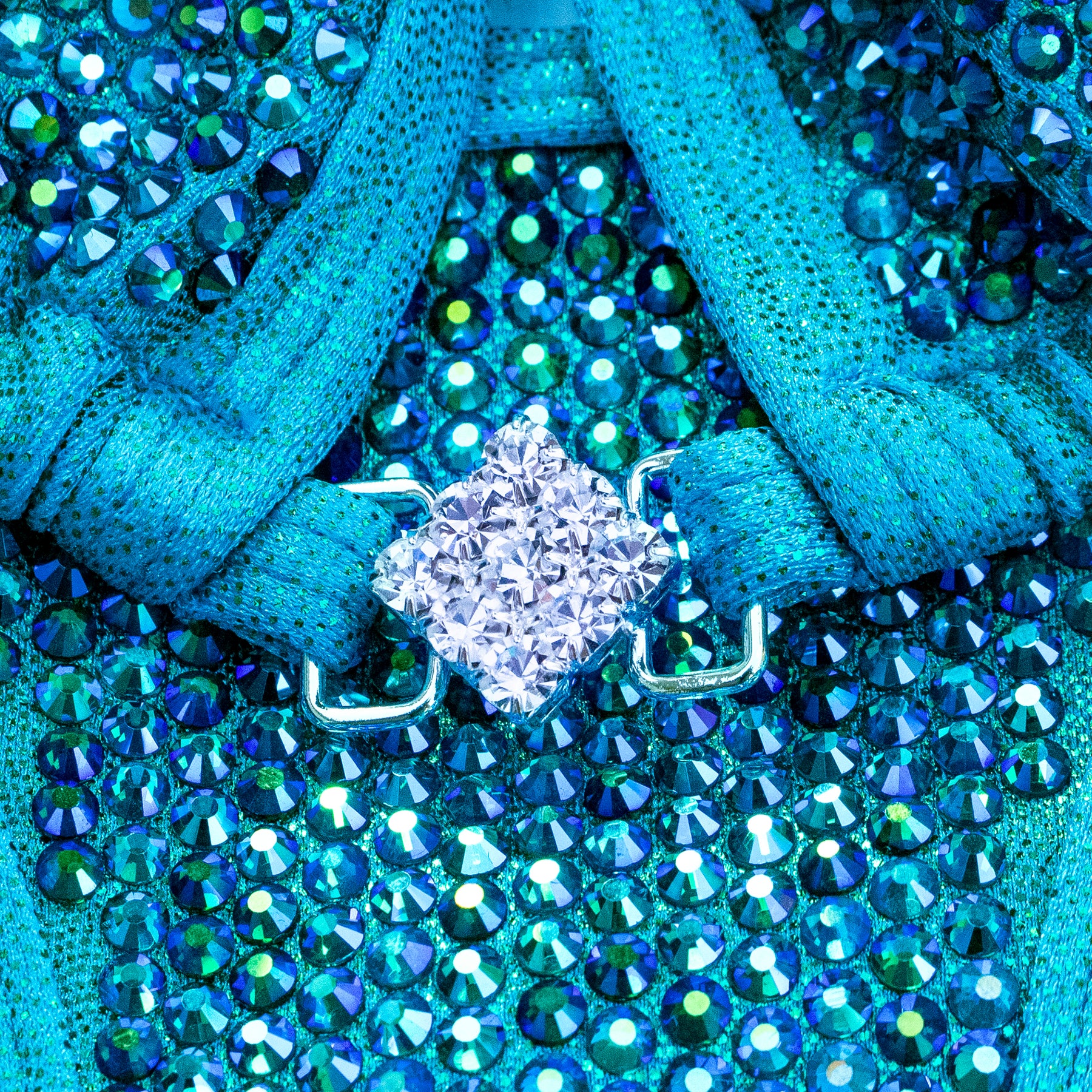 Green on Turquoise fabric encrusted with solid Peacock AB rhinestones, has full lining and pockets for extra padding. Extra padding is included.