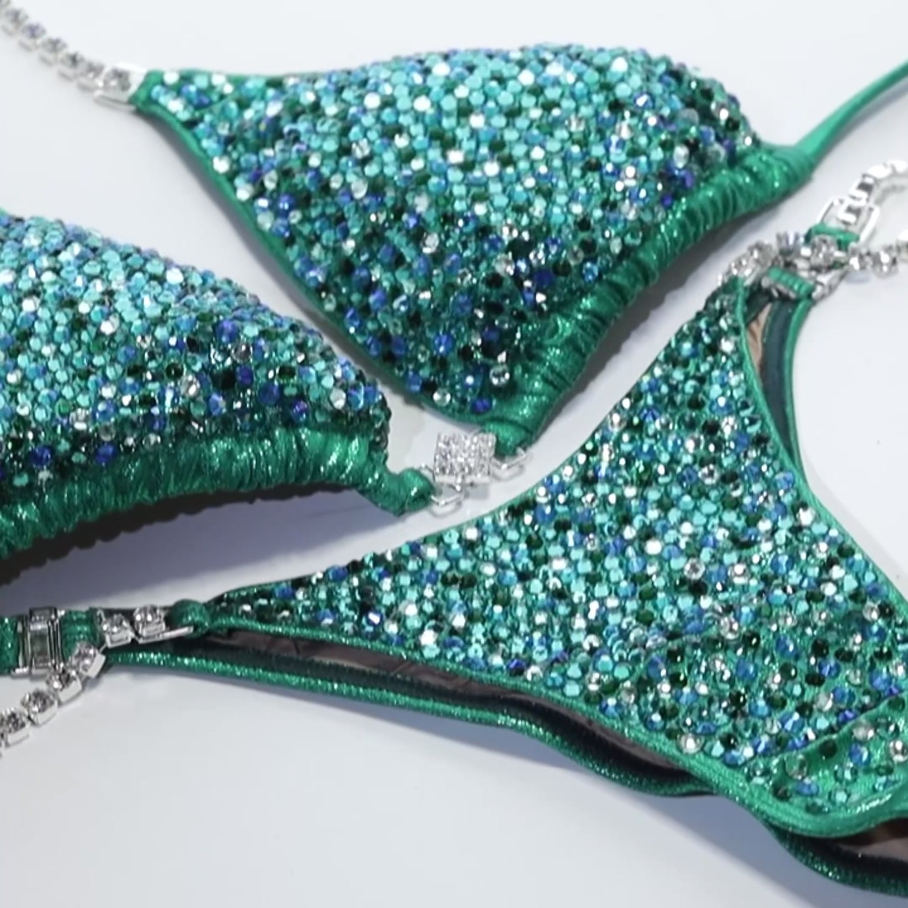 Kelly Green Pin Dot fabric encrusted with Green Zircon, Zircon AB, Emerald Green and Mint rhinestones, has full lining and pockets for extra padding. Extra padding is included in your order.