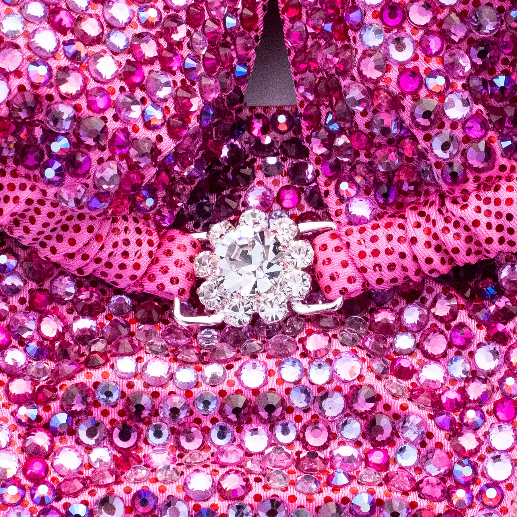 Bubble Gum Pink Cracked Ice fabric encrusted with mix of Light Rose, Rose, Bright Fuchsia and Fuchsia AB rhinestones, has full lining and pockets for extra padding. Extra padding is included in your order.