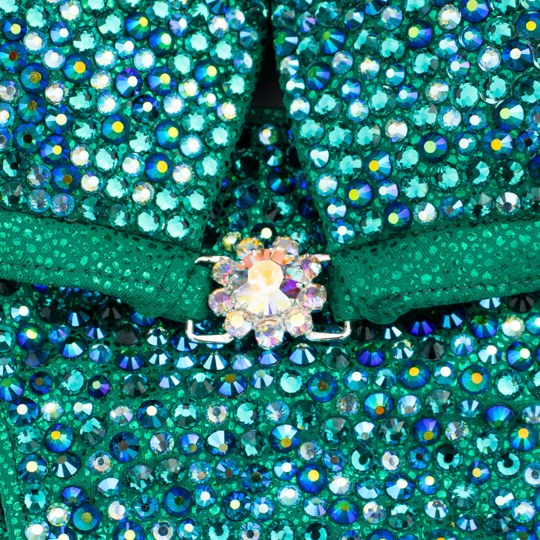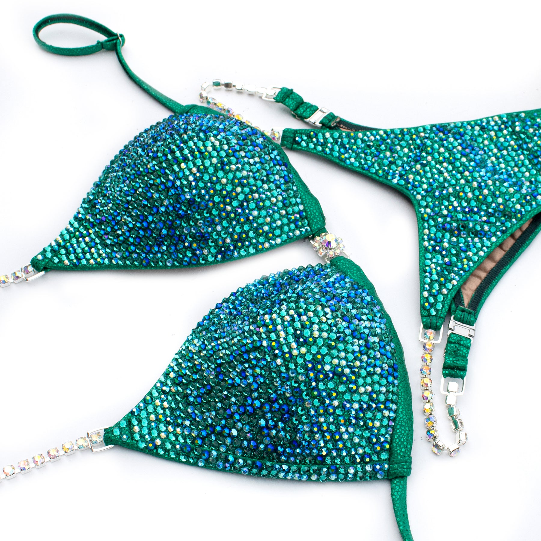 Kelly Green Pebbles spandex encrusted with mix of Zircon, Emerald Green AB, Zircon AB and Aquamarine AB crystals, has full lining and pockets for extra padding. Extra padding is included in your order.