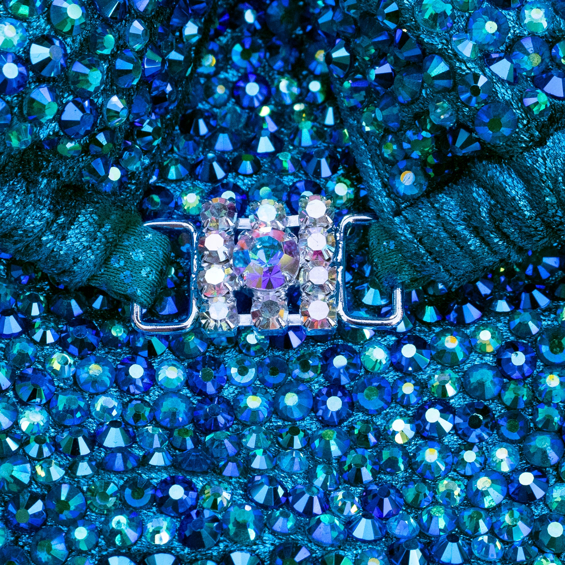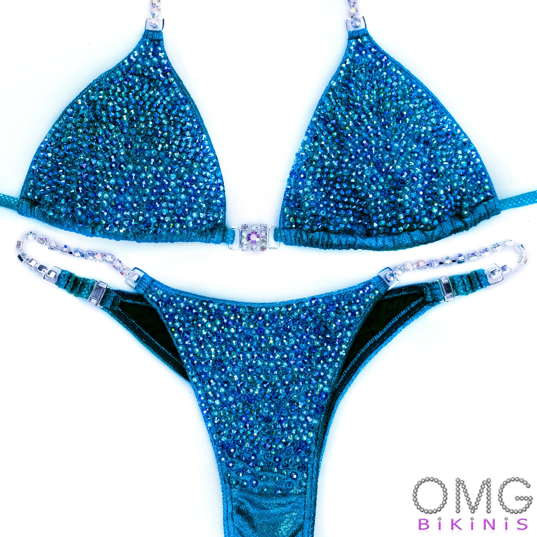 Teal Metallic Velvet Holographic fabric encrusted with combo Sapphire AB, Zircon AB, Peacock AB and Aqua AB rhinestones, has full lining and pockets for extra padding. Extra padding is included in your order.