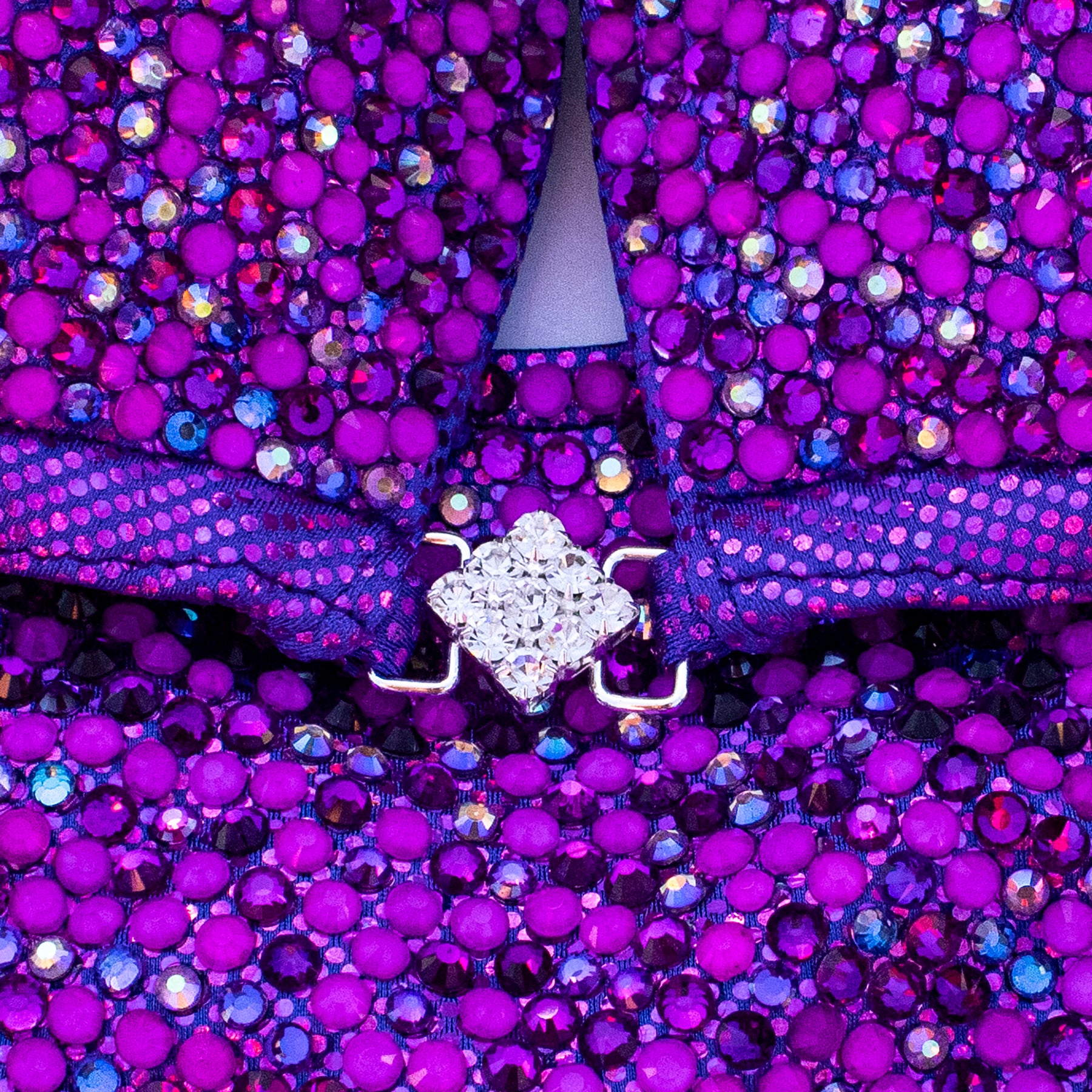 Amethyst Purple Cracked Ice Holo fabric encrusted with Neon Purle, Purple, Purple Velvet and Light Amethyst AB rhinestones, has full lining and pockets for extra padding. Extra padding is included in your order.