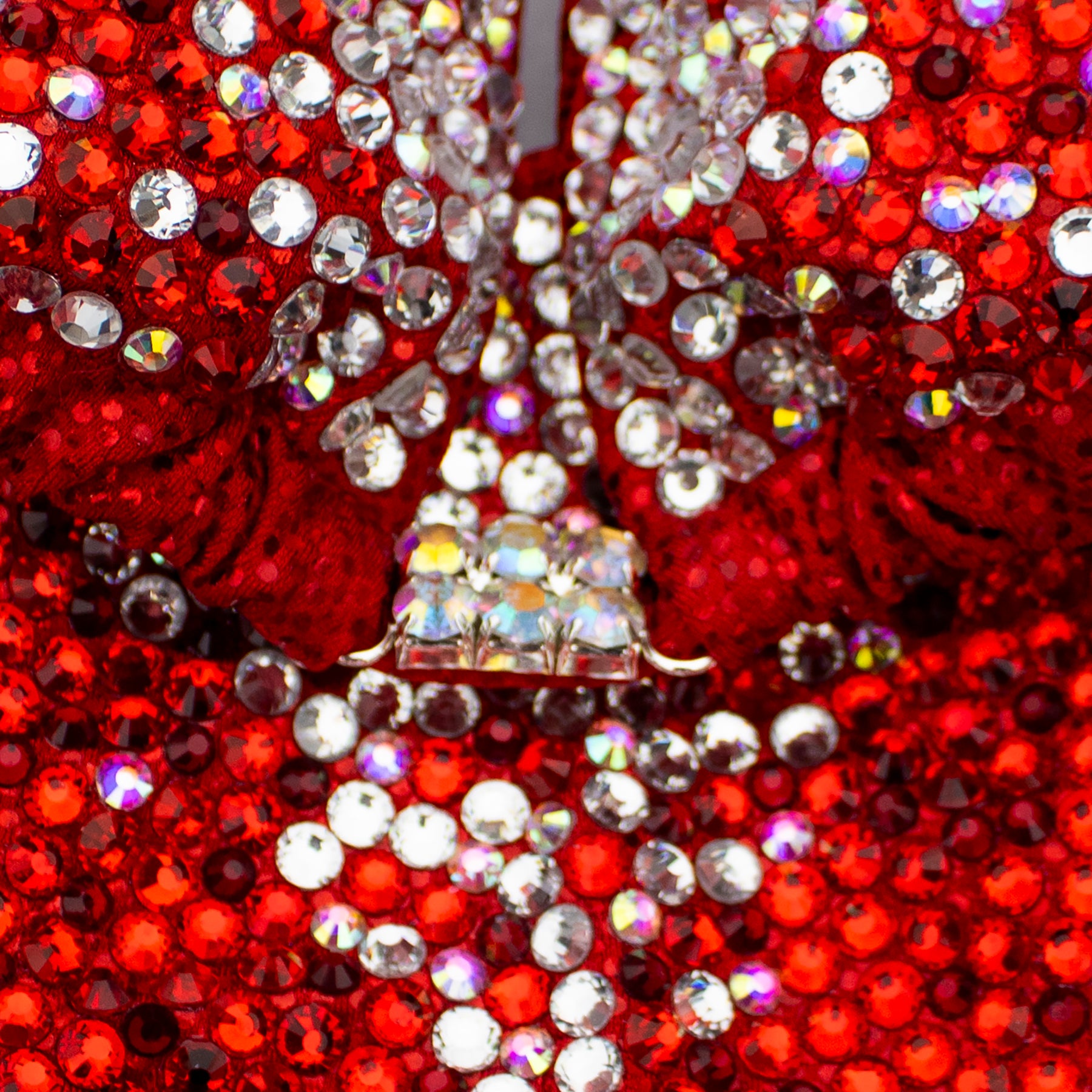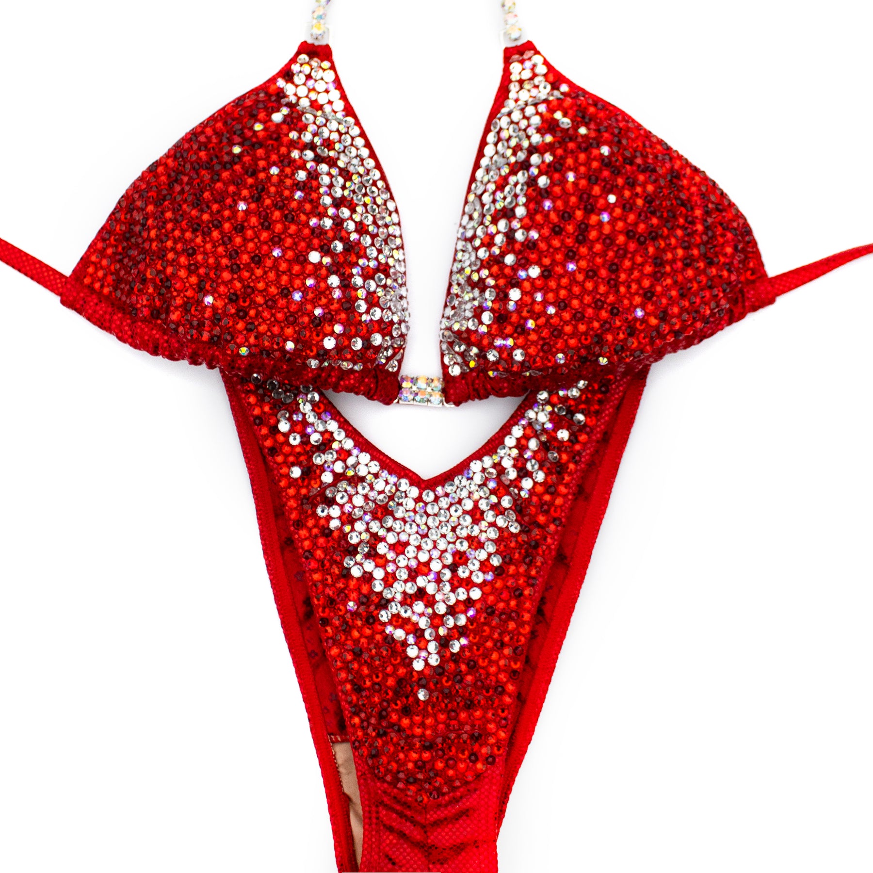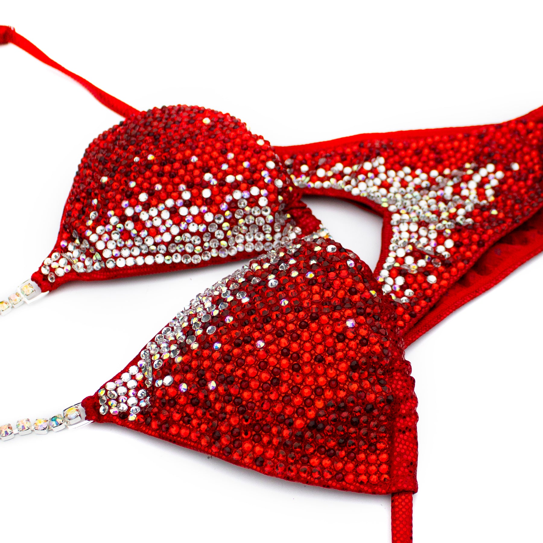 Red Holographic Fabric bedazzled with Siam, Dark Siam, Clear and Clear AB crystal gradient. This competition suit comes with triangle sliding bra cups, regular front and pro cut for the bottoms and extra padding.