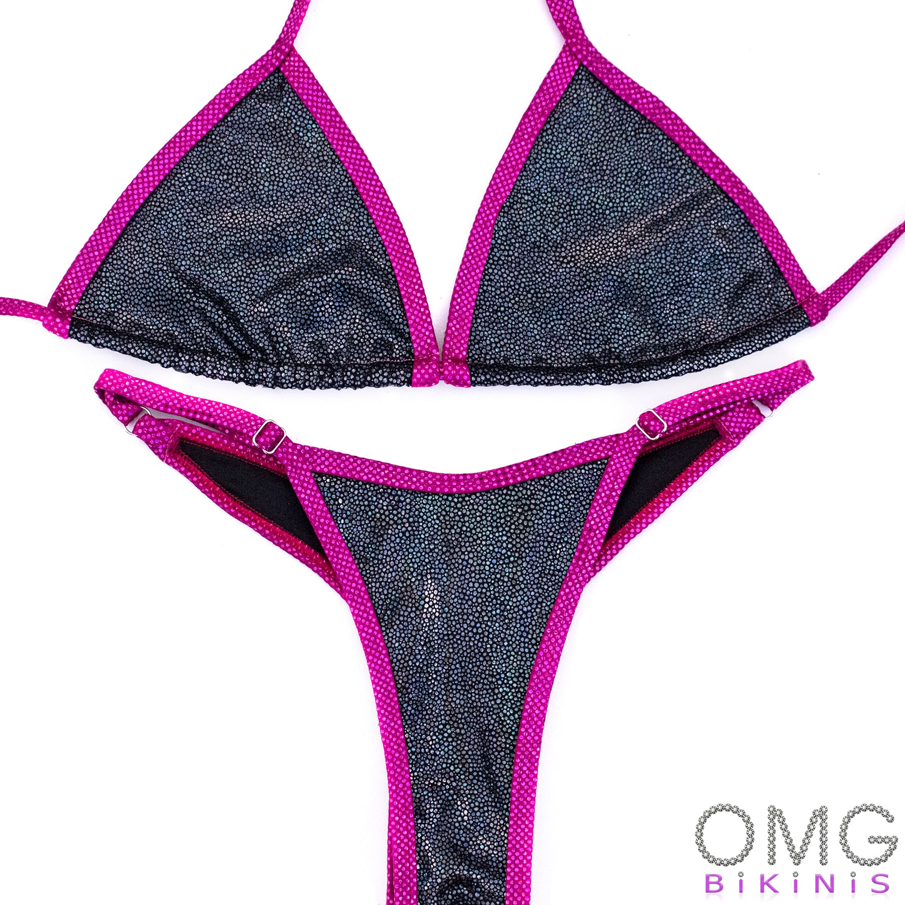 Black Pebbles Holo with Fuchsia Trim Super Basic Posing Suit S/S | Clearance | OMG Bikinis