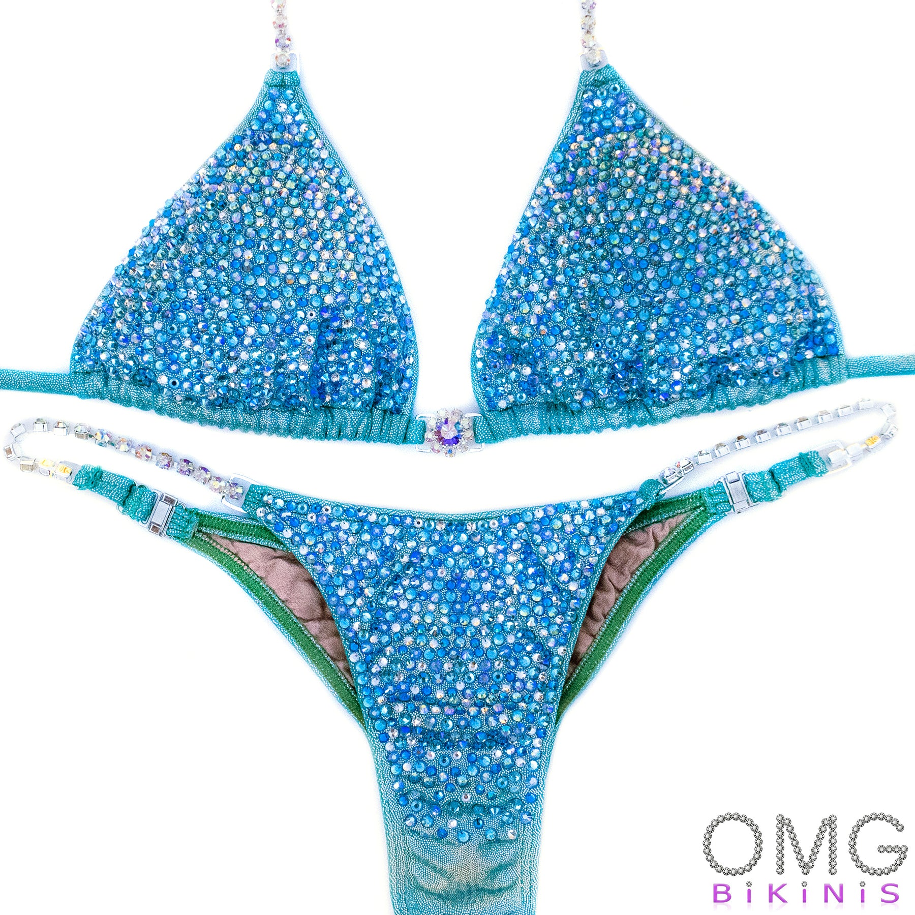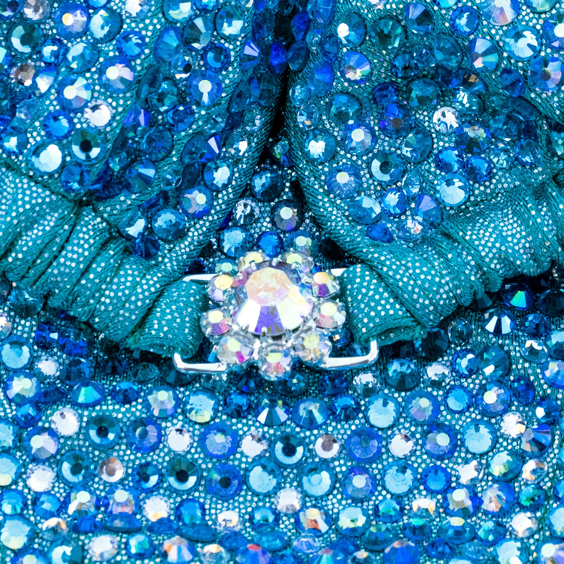 Mint Holographic fabric encrusted with combo of Aqua, Light Sapphire AB, Capri Blue and Clear rhinestones, has full lining and pockets for extra padding. Extra padding is included in your order.