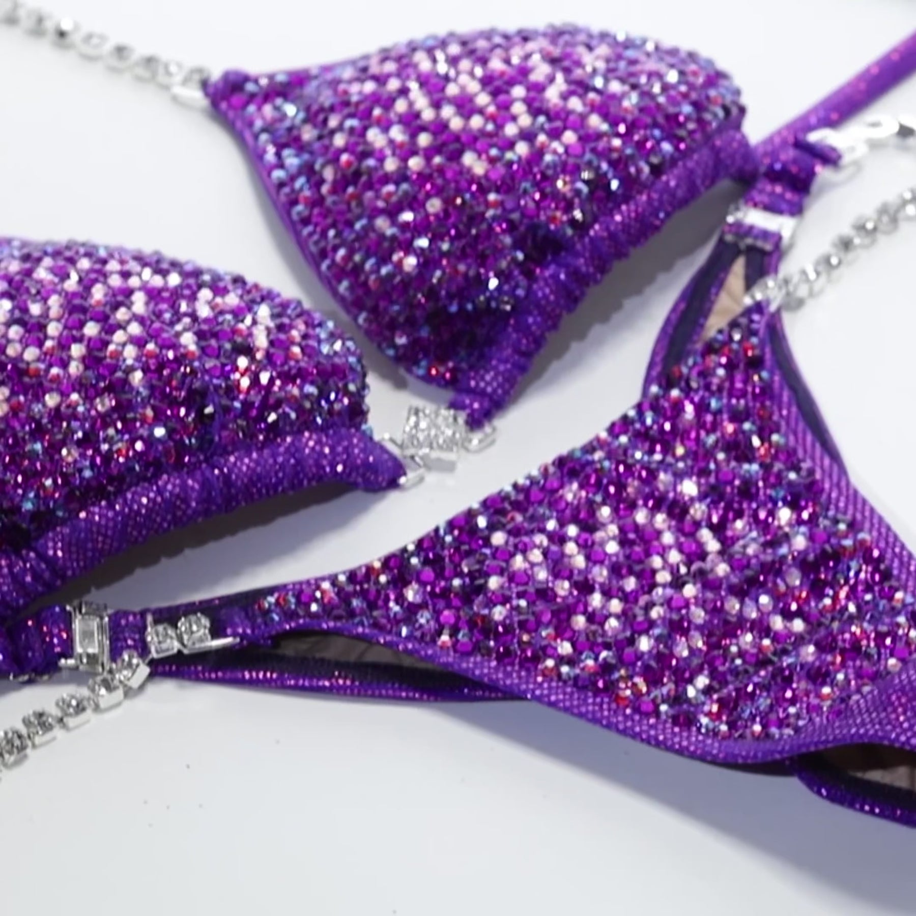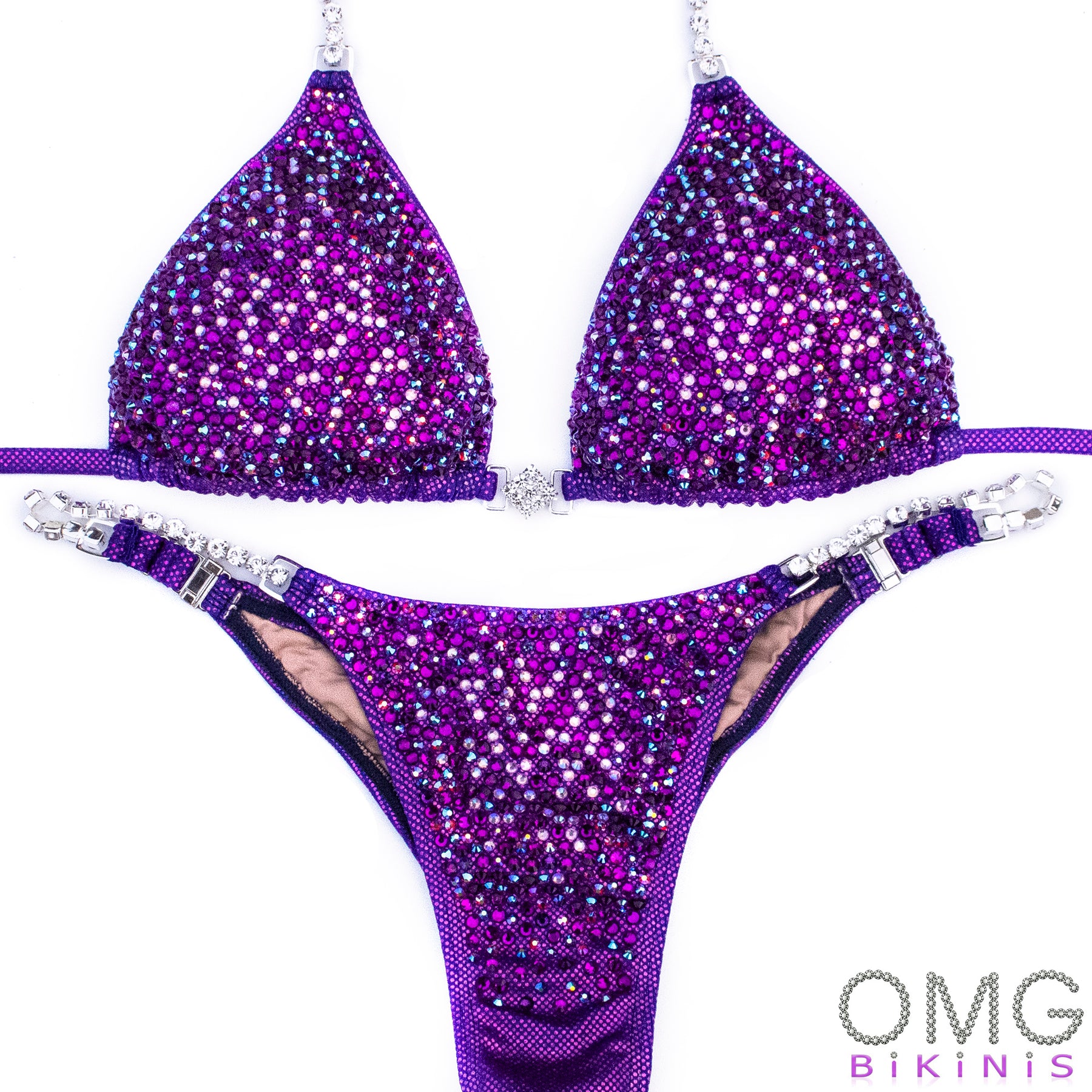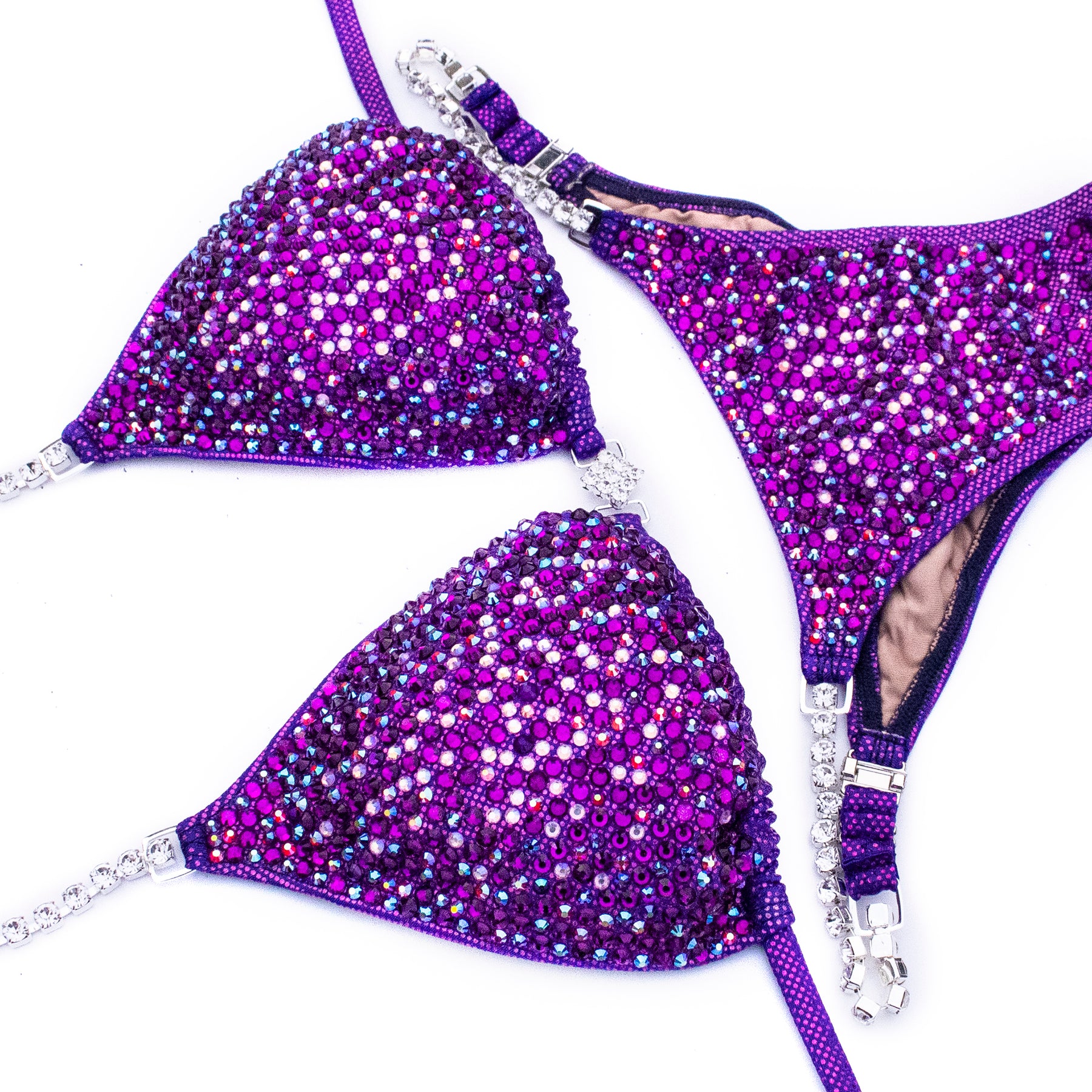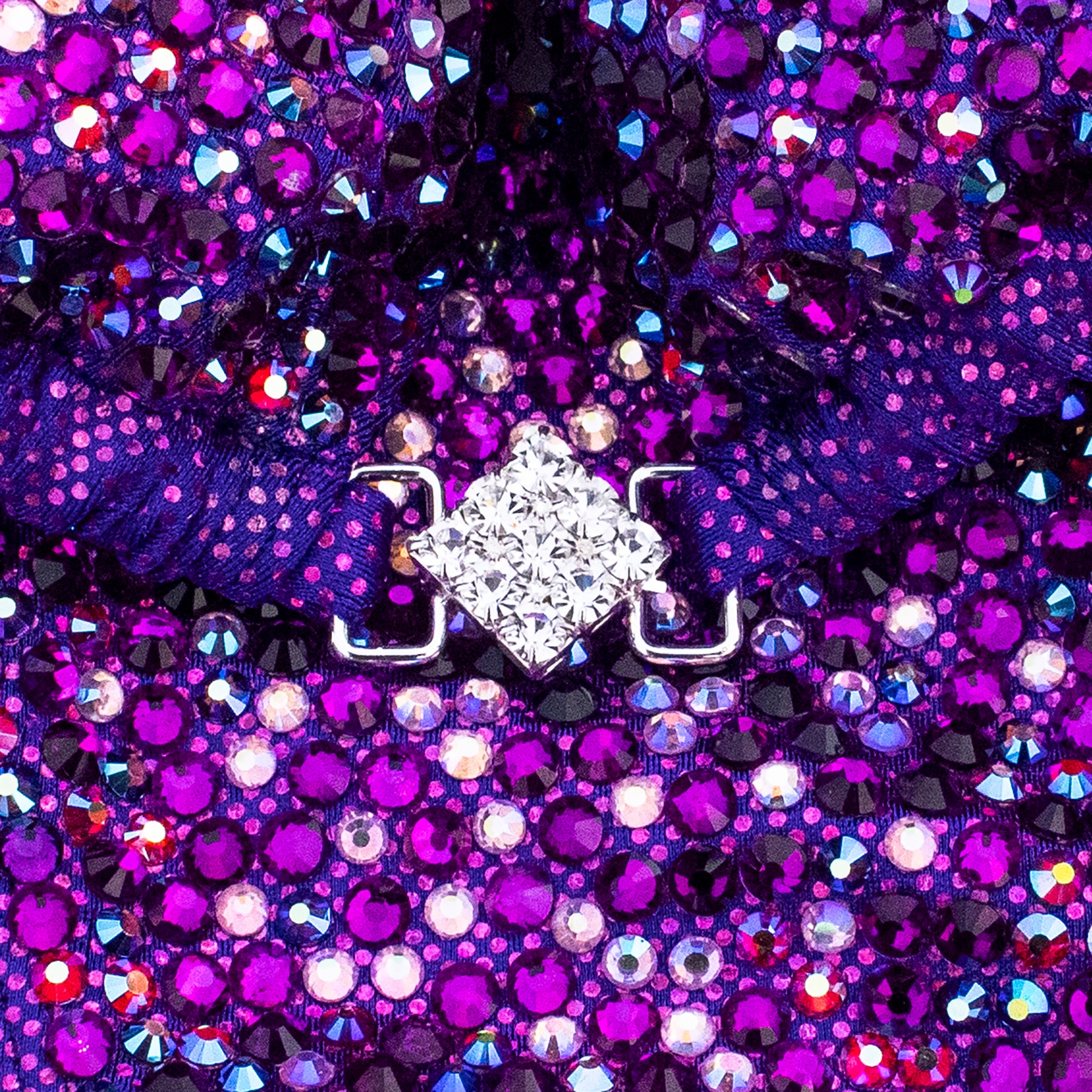 Fuchsia Lavender Fabric encrusted with mix of Grape, Dark Amethyst AB, Siam AB, Light Pink AB rhinestones, has full lining and pockets for extra padding. Extra padding is included in your order.