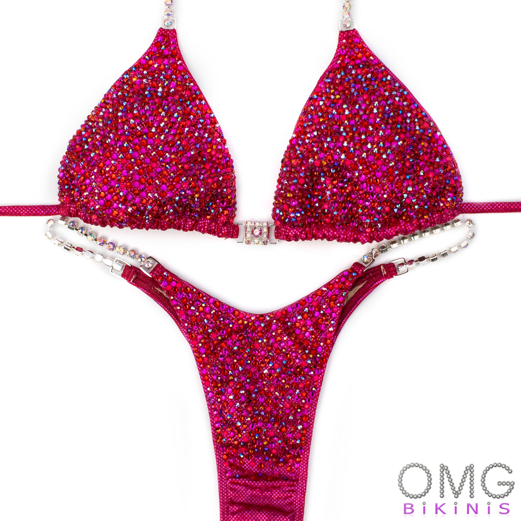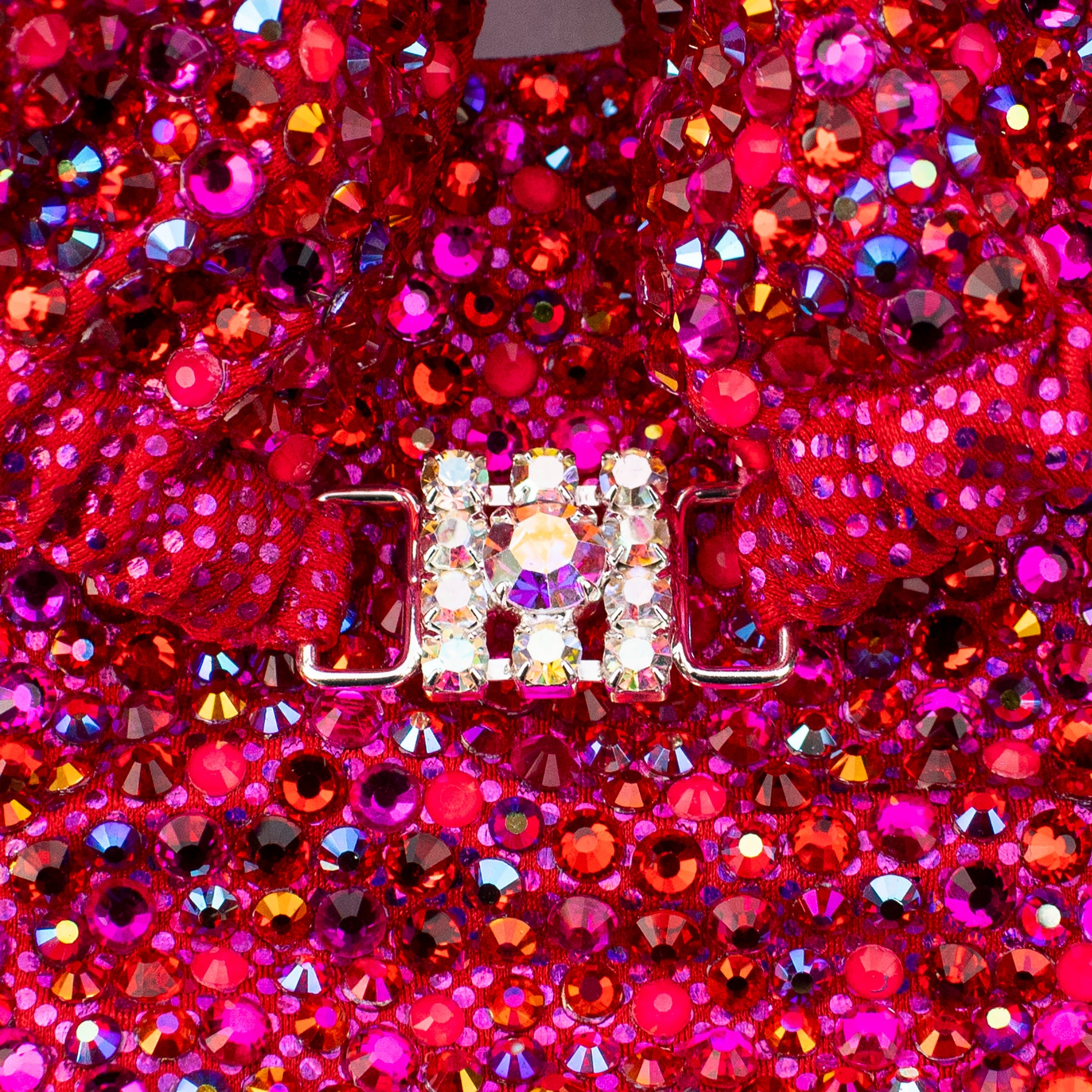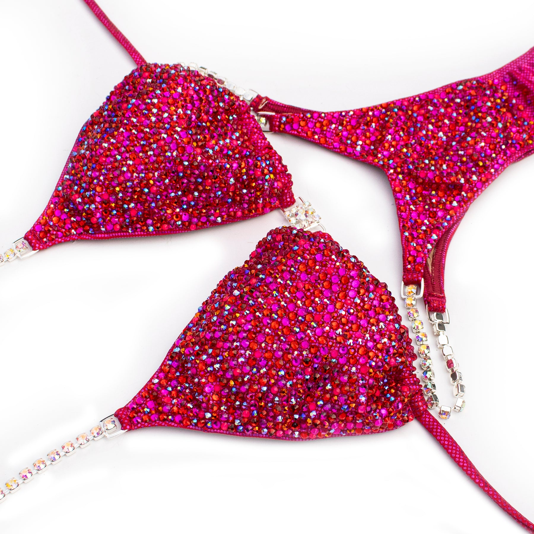 Red Fuchsia Cracked Ice fabric encrusted with mix of Siam, Bright Fuchsia, Siam AB, Magenta AB and Neon Pink rhinestones, has full lining and pockets for extra padding. Extra padding is included in your order.