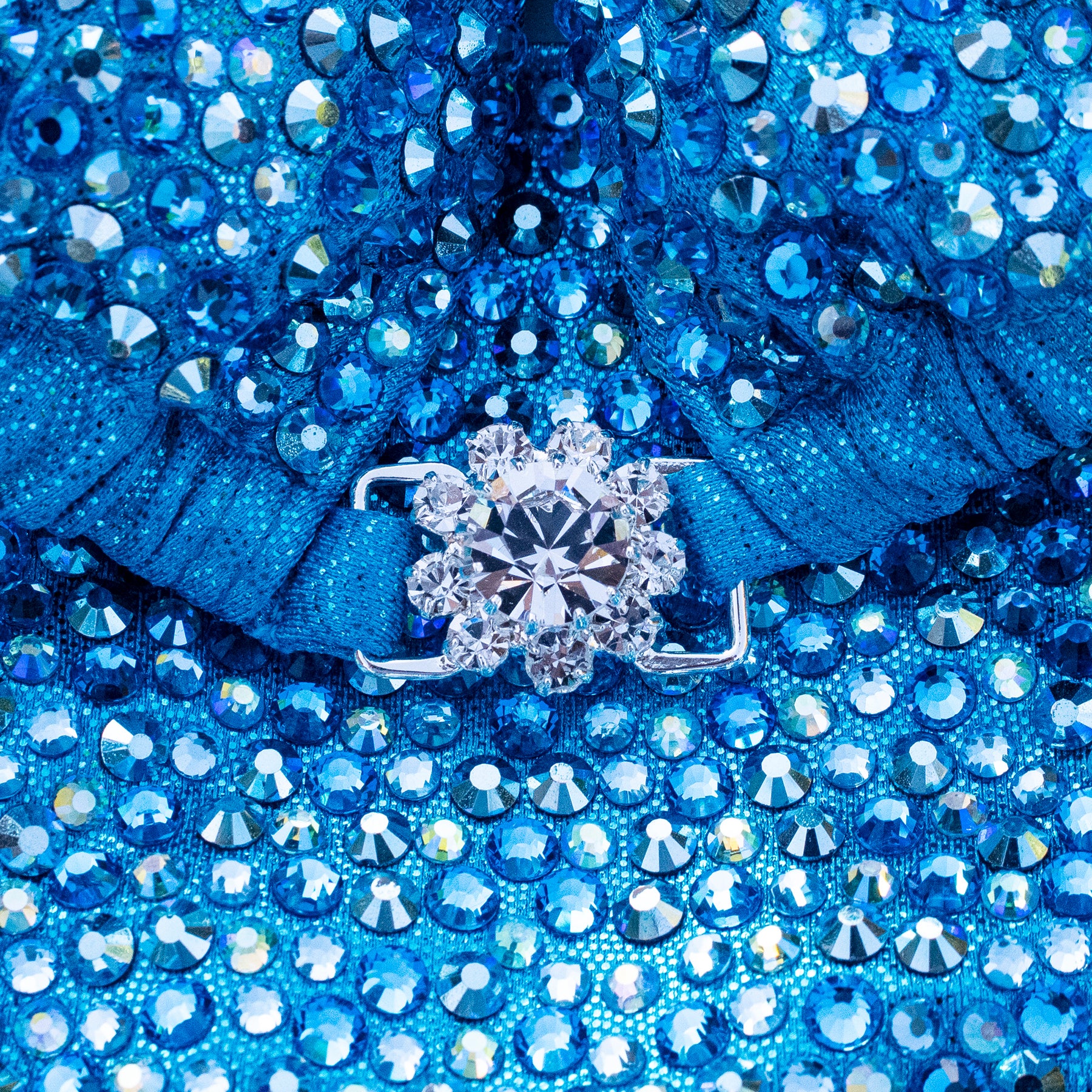 Turquoise Holographic Pin Dot Fabric encrusted with combo of Metallic Aqua, Aqua and Aqua AB rhinestones, has full lining and pockets for extra padding. Extra padding is included. Comes with connectors like on the picture.