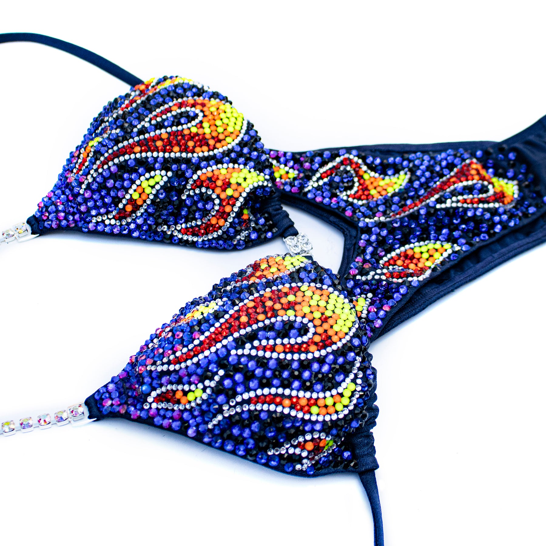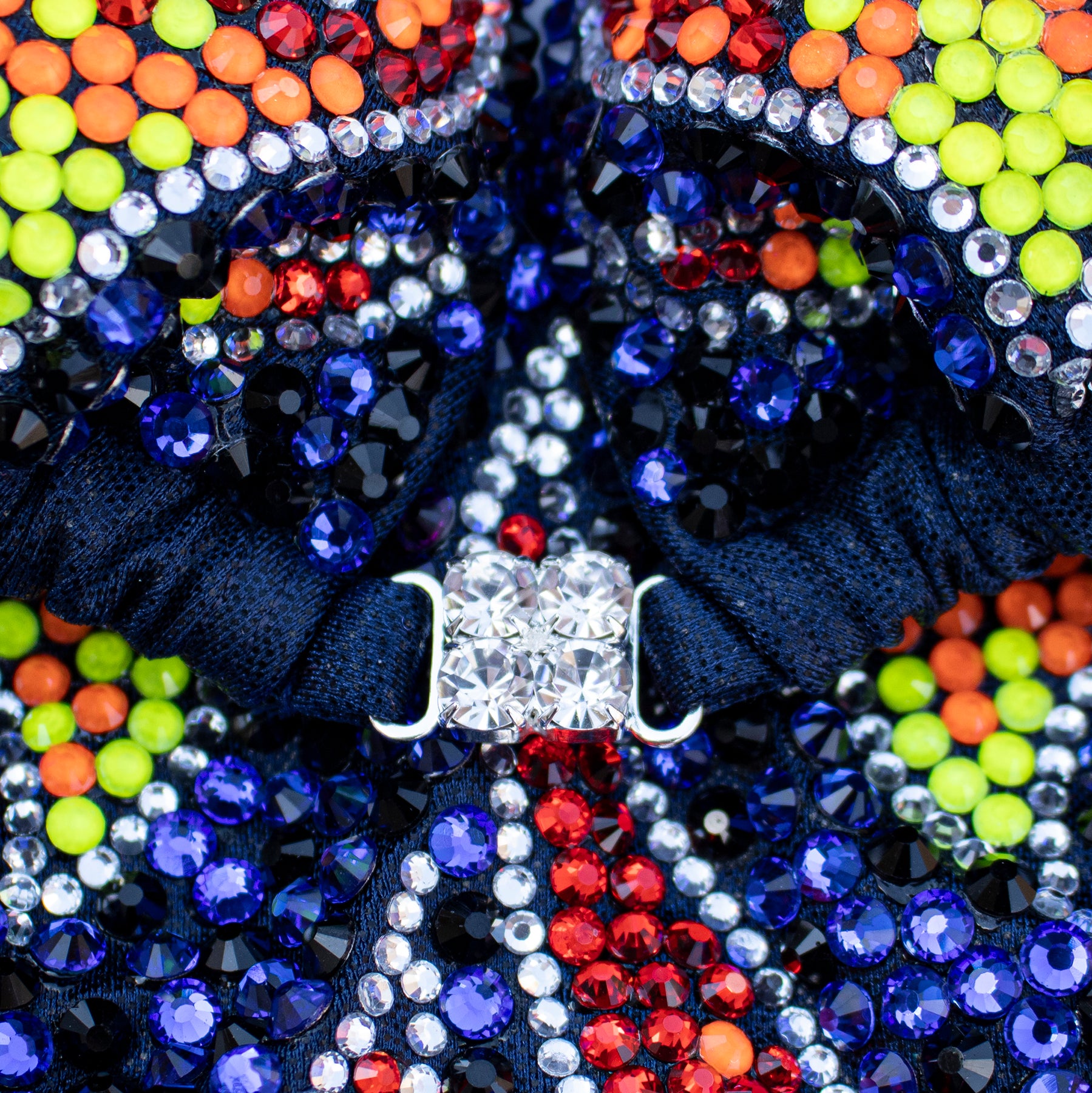 Navy Blue Pin Dot Fabric bedazzled with ornament of Neon Yellow, Neon Orange, Siam, Clear, Blue, Purple Velvet and Black rhinestones.  This competition suit comes with triangle sliding bra cups, regular front and pro cut for the bottoms and extra padding.